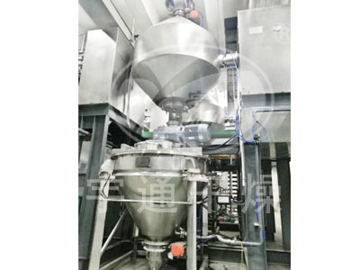 機(jī)組除了主體雙錐回轉(zhuǎn)真空干燥機(jī)外還包含自動(dòng)進(jìn)料對(duì)接裝置、模溫機(jī)高溫油加熱系統(tǒng)、真空過濾器冷凝回收系統(tǒng)、出料自動(dòng)對(duì)接裝置、螺帶冷卻機(jī)。上部離心機(jī)或壓濾機(jī)完成工作后雙錐干燥機(jī)進(jìn)料裝置自動(dòng)對(duì)接使物料加入雙錐干燥機(jī)內(nèi),然后抽真空系統(tǒng)和模溫機(jī)系統(tǒng)自動(dòng)運(yùn)行進(jìn)行烘干,到底預(yù)設(shè)時(shí)間后,自動(dòng)出料裝置自動(dòng)對(duì)接,將雙錐內(nèi)烘完的物料投入螺帶冷卻機(jī)降溫,冷卻到預(yù)設(shè)時(shí)間后可與后部氣力輸送系統(tǒng)聯(lián)鎖直接進(jìn)成品料倉儲(chǔ)存。