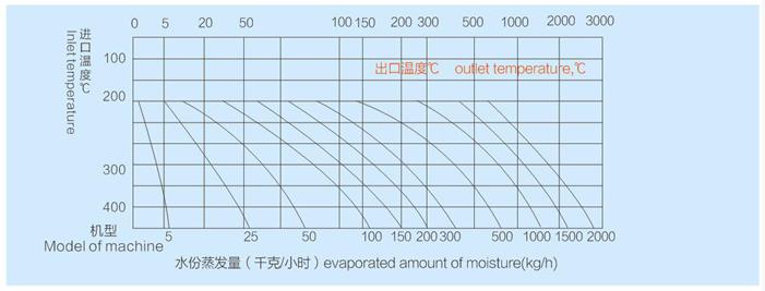 水份蒸發(fā)量與物料的特性及熱進風、出口溫度相關。當出口溫度為90oC,其水份蒸發(fā)曲線見上圖(供選型參考),隨著產品不斷更新,有關參數變更,恕不預先通知。